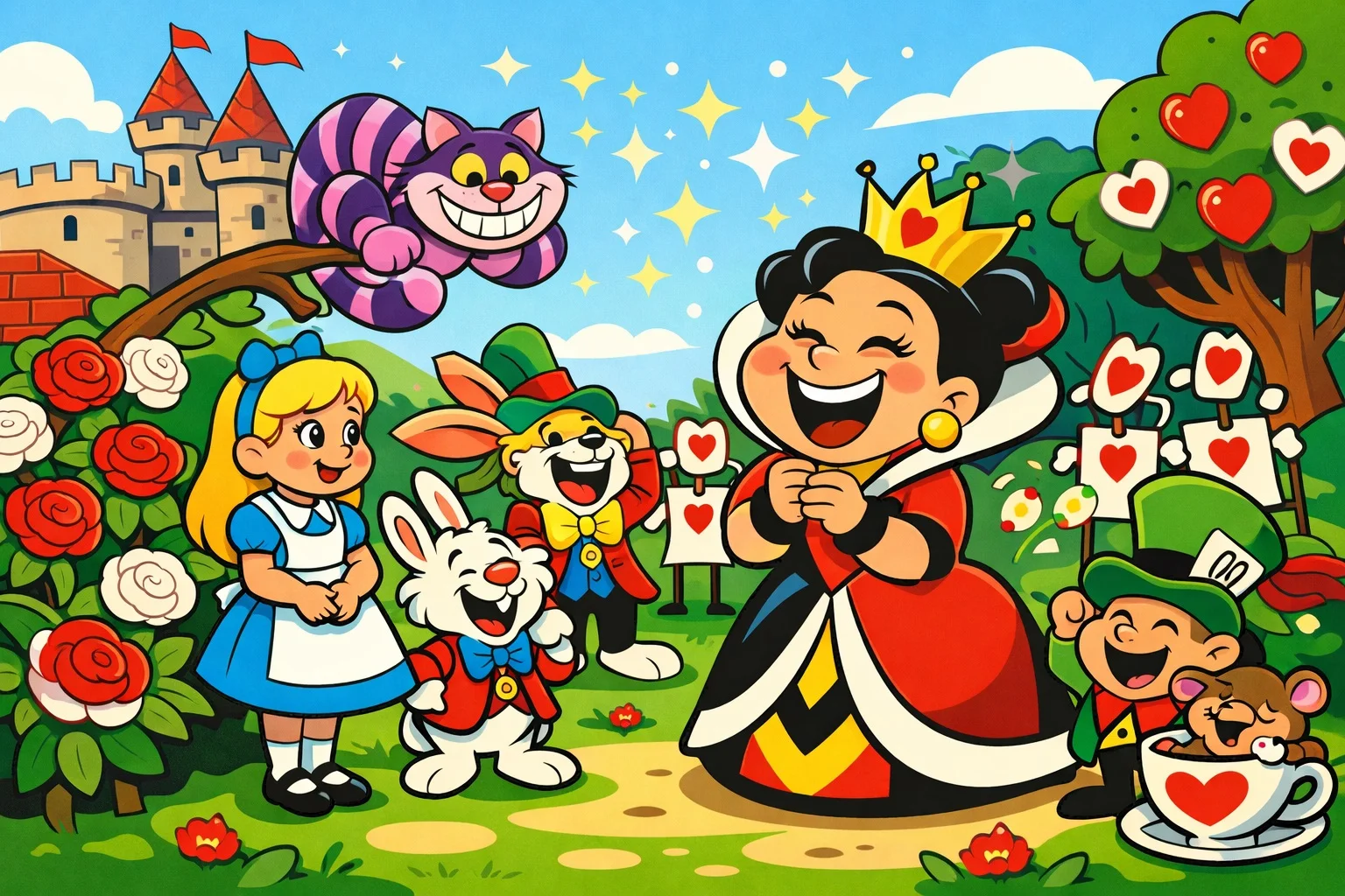 Kupa Kraliçesi bu fısıltıyı duydu ve bu kez gerçekten güldü. Bahçedeki güller canlandı, renkleri parladı, kart askerler dans etmeye başladı. Hatta Kraliçe’nin “Kafası uçsun!” sözü bile değişti.