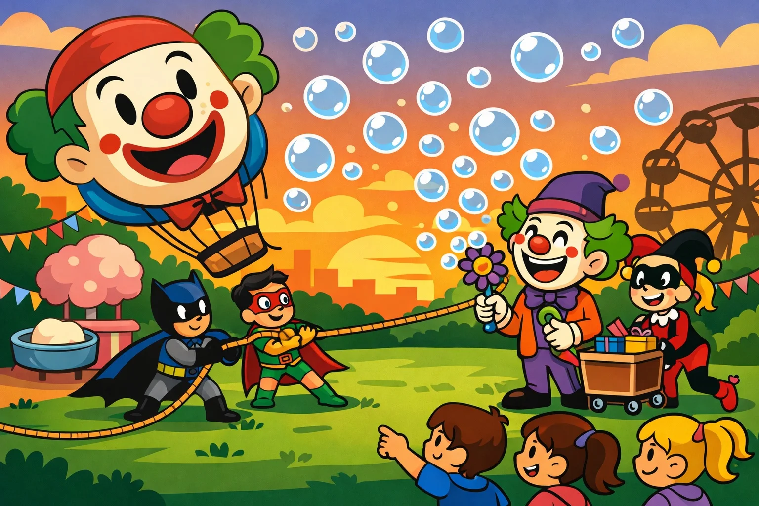 Harley Quinn kutulardan birini açtı. İçinden… şeker değil, minik sabun köpüğü makineleri çıktı! Joker çiçeğini sıkınca su yerine sabun köpüğü püskürdü. Park bir anda köpükle doldu. Çocuklar önce irkildi, sonra kahkahalar yükseldi. Köpükler güneşte parlıyor, küçük bulutlar gibi uçuşuyordu.