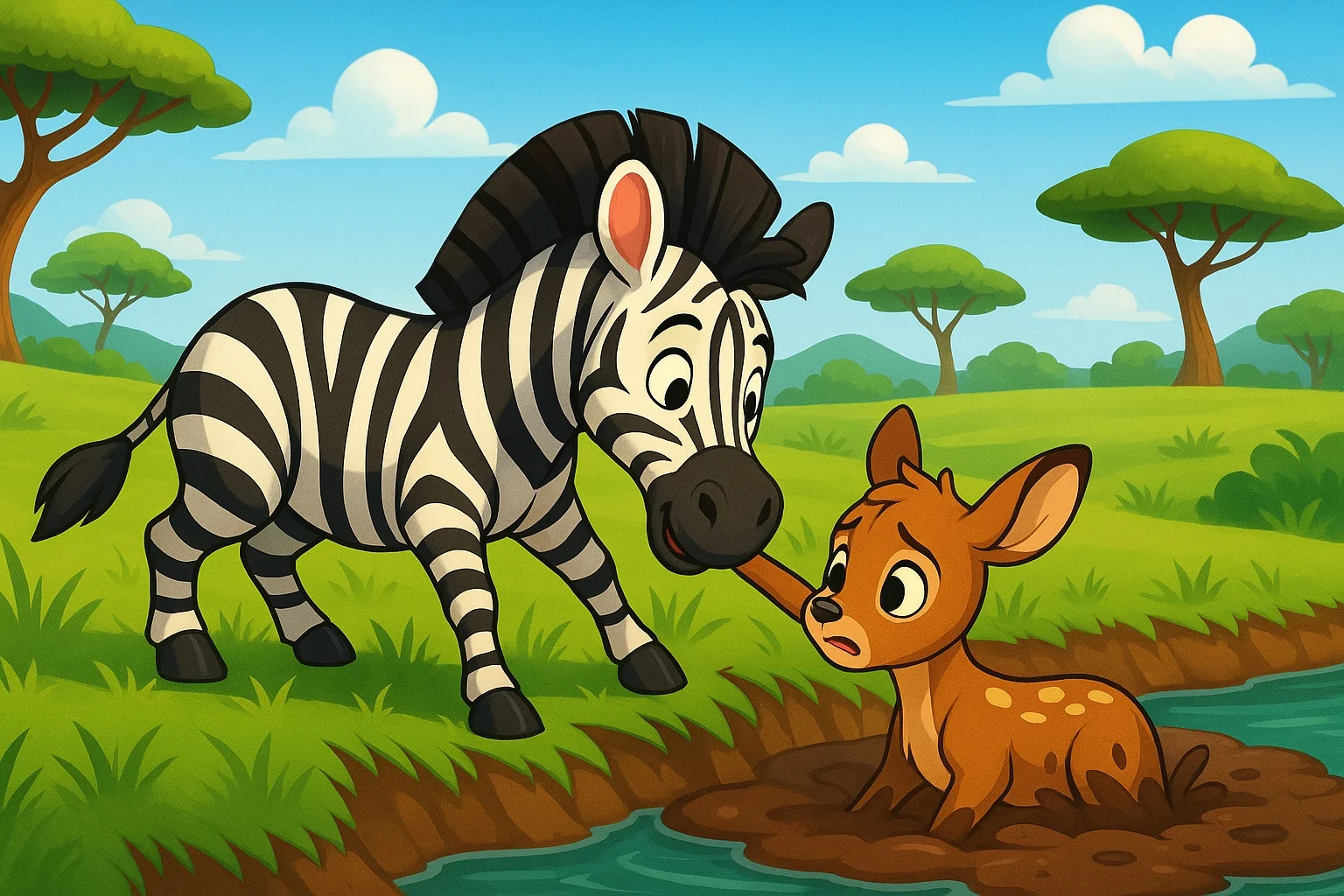 Nehrin kenarında beklenmedik bir şey olmuş. Suyun karşı kıyısında, küçük bir ceylan yavrusu çamura saplanmış halde duruyormuş. Gözleri korkuyla doluymuş.