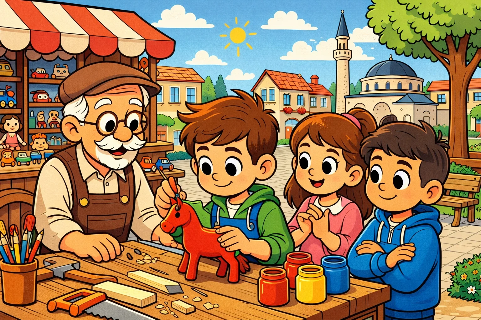 Bir gün okul çıkışında Emre, en yakın arkadaşı Zeynep ve komşuları Yusuf ile birlikte mahalle meydanında oynuyordu. Meydanda yaşlı bir amcanın küçük bir oyuncak tezgahı vardı. Rengarenk tahta düdükler, topaçlar, bez bebekler, küçük arabalar dizilmişti. Emre o tezgahı çok severdi. Özellikle de köşede duran kırmızı boyalı küçük tahta atı.