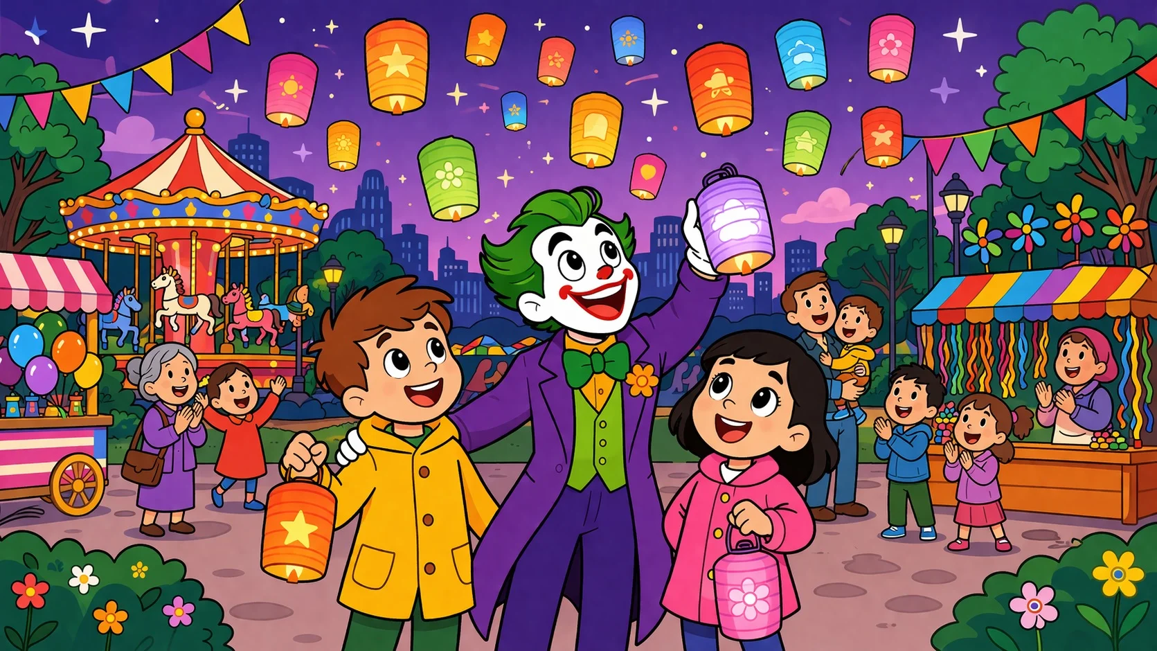 Şenliğin yapılacağı meydanın yakınındaki dar sokaklardan birinde, mor ceketi ve yeşil saçlarıyla Joker yavaş yavaş yürüyordu. Ama bu kez yüzünde alışılmış yaramaz bir ifade yerine merakla karışık neşeli bir gülümseme vardı. Elinde kırmızı bir balon, cebinde de rengarenk iskambil kâğıtları taşıyordu. Şehirde herkes onu tanıyordu ama bugün Joker’in aklında hiçbir yaramazlık yoktu. O günün tek bir amacı vardı: çocukları güldürmek.