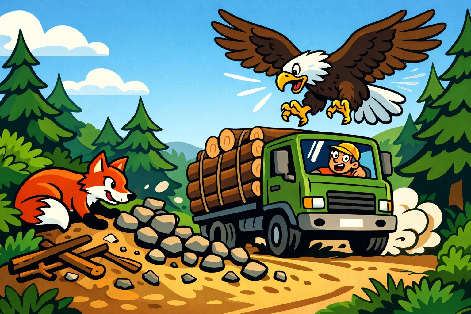 Tam o sırada Kıvanç harekete geçti. Gökyüzünden bir gölge gibi süzüldü, kamyonun önünde keskin bir çığlık attı. Sürücü irkildi, fren yaptı. Eylül bunu duyunca planın ikinci kısmına geçti: Çalılıkların içinden hızla dolaşıp bir taş yığınına çarptı, taşlar yuvarlanıp patikada şakırdadı. Sanki ormanın içinden bir sürü küçük ayak koşuyordu.
