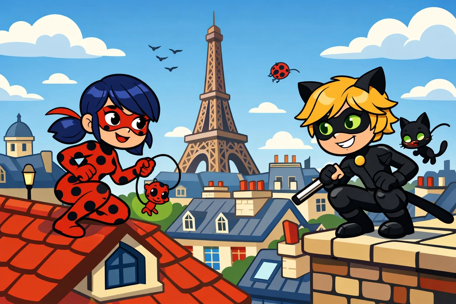 Okuldan sonra çatılara çıkan Mucize Uğur Böceği, Paris’e baktı. Kara Kedi yanına geldi.