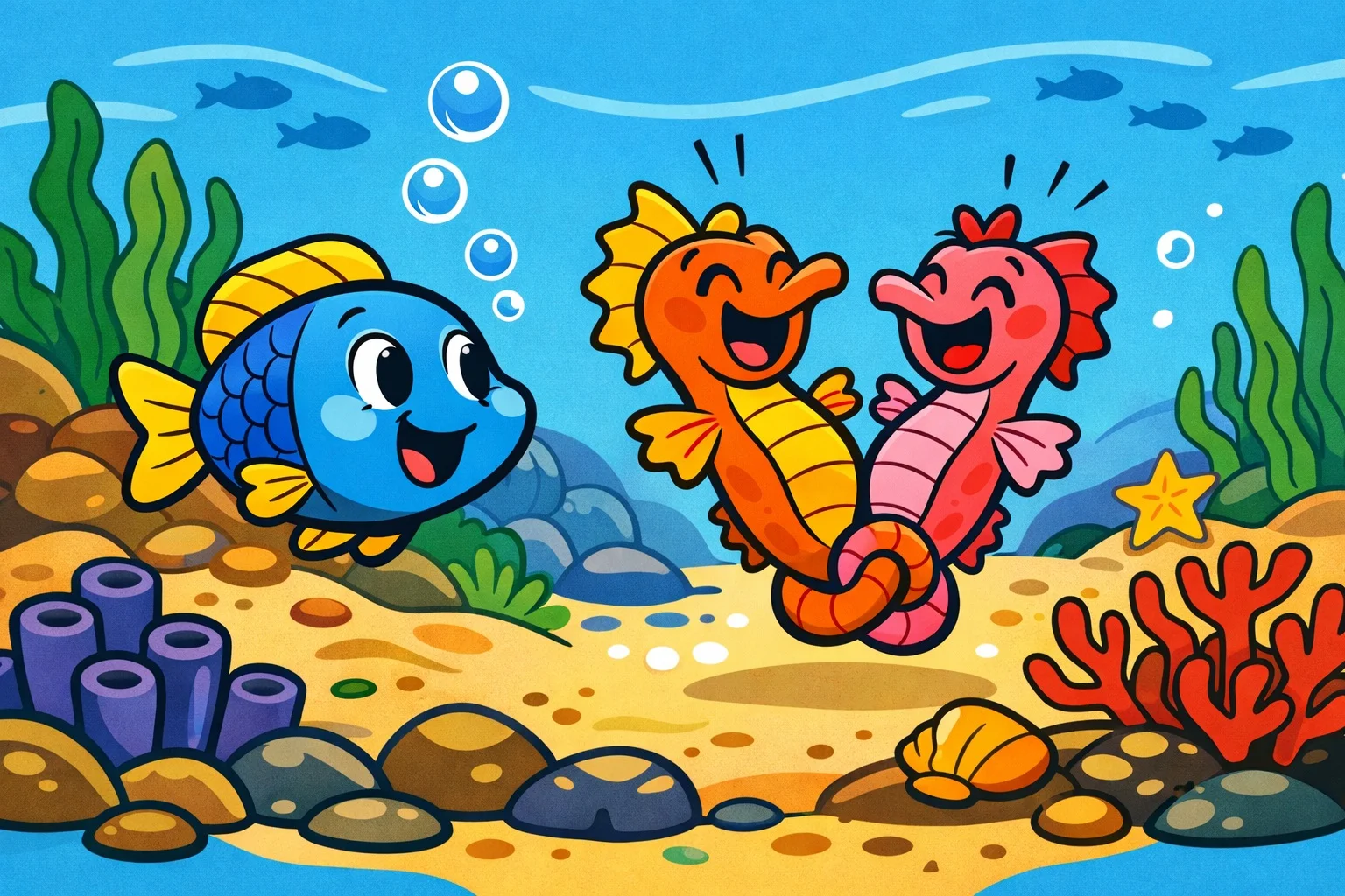 Böylece arkadaşlar dört bir yana dağılmış. Maviş önce inci beyazı kumların olduğu sığ tarafa gitmiş. Orada iki küçük denizatı birbirine kuyruğunu dolamış, dönüp durarak oyun oynuyormuş. Maviş onları görünce içi ısınmış.