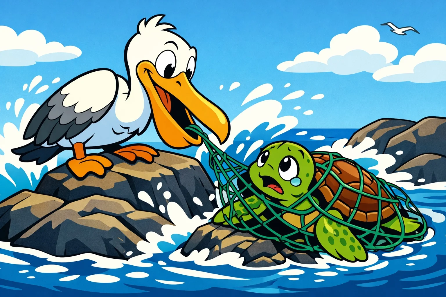 — Korkma! diye bağırdı Poyraz, tabii pelikan diliyle. Ama o an, kaplumbağa sanki onu anladı.