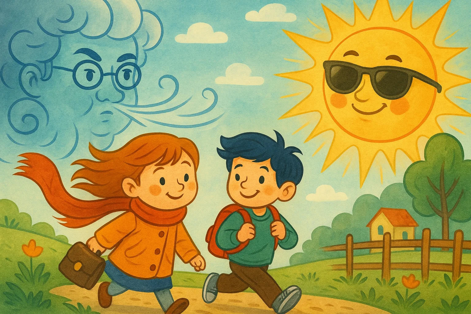 Gökyüzünün yükseklerinde, mavi boşluğun derinliklerinde iki kadim dost yaşarmış: neşesine sığmayan ama iyi kalpli Rüzgar ile, yüzünde her daim huzurlu bir tebessüm taşıyan Güneş.