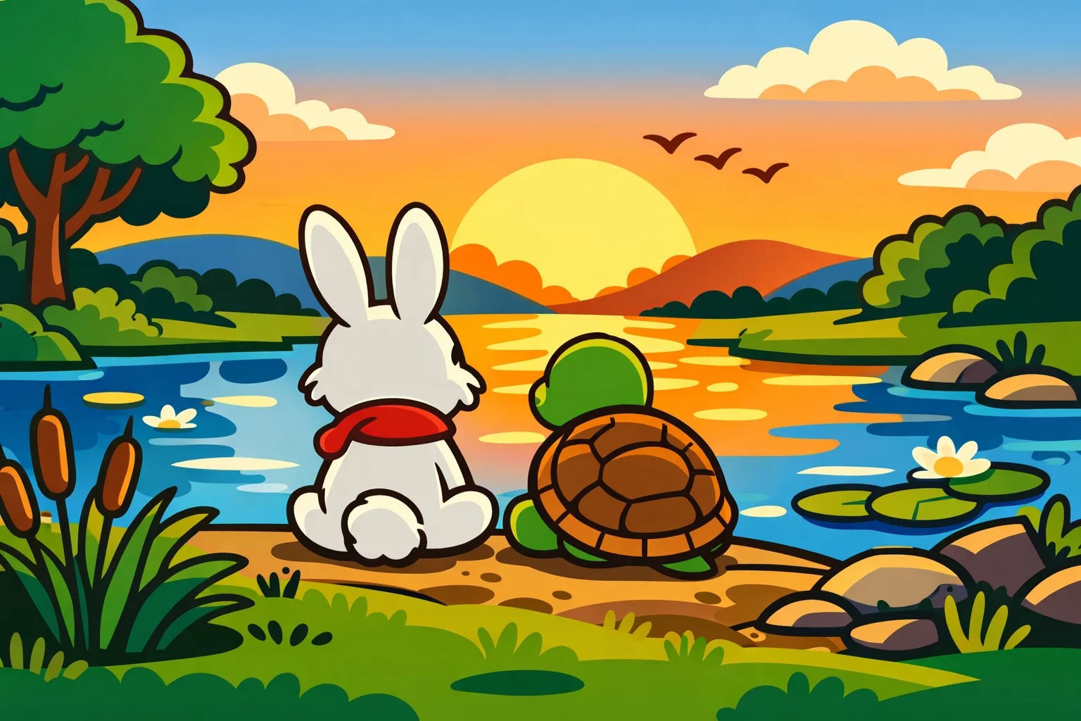 Akşam olunca göletin kenarına oturdular. Gökyüzü turuncuya dönmüştü.