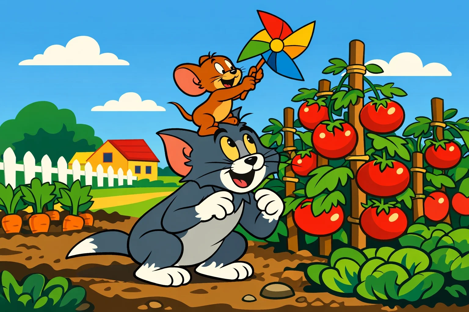 Çitin ötesi küçük bir sebze bahçesiydi. Yel değirmeni, domates sırıklarının arasına sıkışmıştı. Jerry dar aralıklardan kolayca geçebilirdi ama yel değirmeni biraz yüksekte kalmıştı. Tom ise uzun boyuyla yetişebilirdi ama sırıkların arasına rahat giremiyordu. Birbirlerine baktılar. İkisinin de aklına aynı fikir geldi.