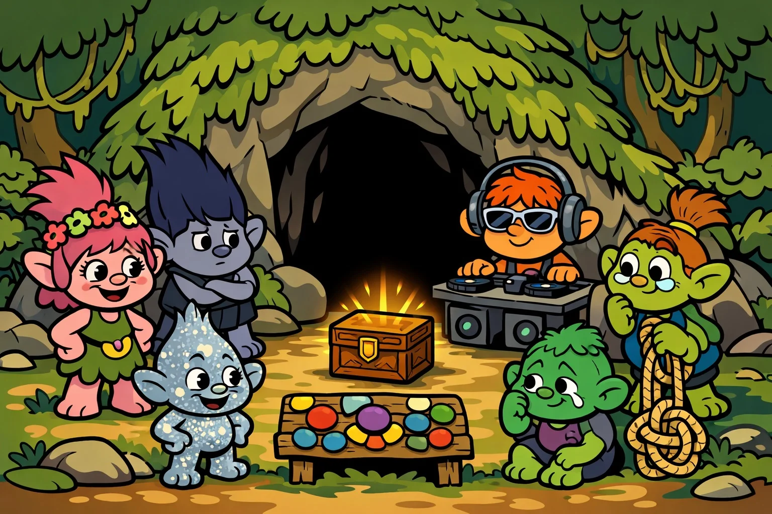 Köyün üstünde o sabah gökyüzü pamuk şeker gibiydi ama Bergenlerden kalan eski bir alışkanlık yüzünden, troller hâlâ güne başlarken “neşeyi ölçer” gibi etrafa bakardı. Her şey normal görünüyordu: Renkli çiçek evler, dallardan sallanan ip merdivenler, kahkaha kokan rüzgâr… Yine de Poppy’nin içi, sanki bir şey hafifçe eksilmiş gibi kıpır kıpırdı.
